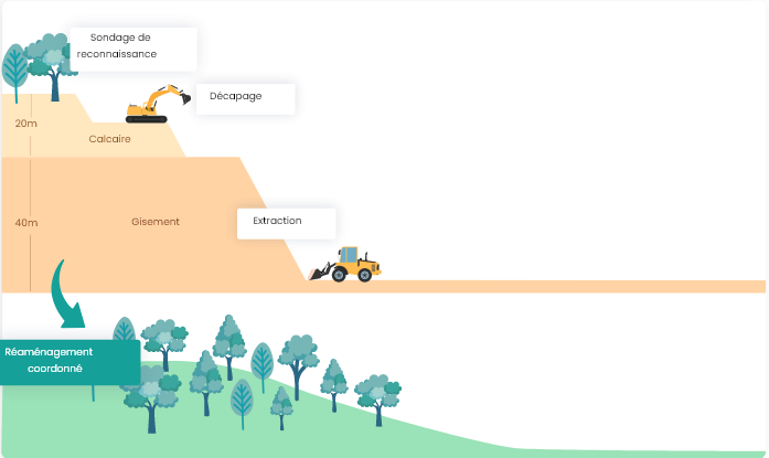 Les grandes étapes : – Décapage et mise en stock des matériaux de découverte (terre végétale) – Exploitation des couches de matériaux calcaires et grès (minage, dent vibrante) – Exploitation du sable siliceux par paliers en fonction des qualités (granulométrie, chimie) – Criblage des éléments les plus grossiers
